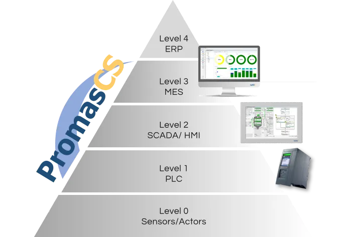 PromasCS combines the control level, the process control level (operating and monitoring) and the Manufacturing Execution System (MES) in a single, fully integrated platform.